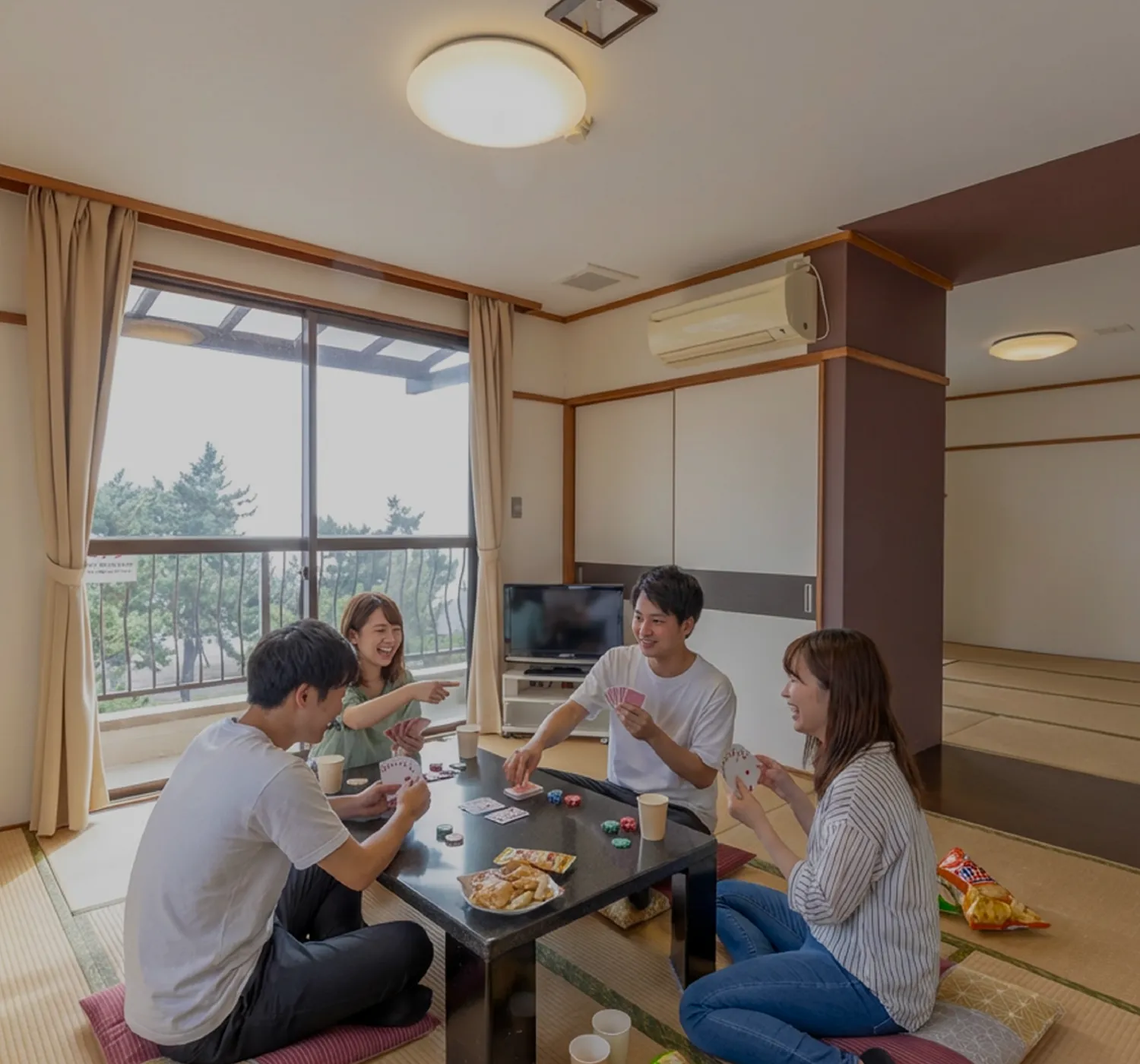 20畳の広々とした民宿風和室で、最大12名まで宿泊可能。琵琶湖とサニービーチを一望できる大きなテラスがあり、開放感抜群です。合宿や親族旅行など大人数利用に最適ですが、防音性が高くないため静かに過ごせる方向けのお部屋です。